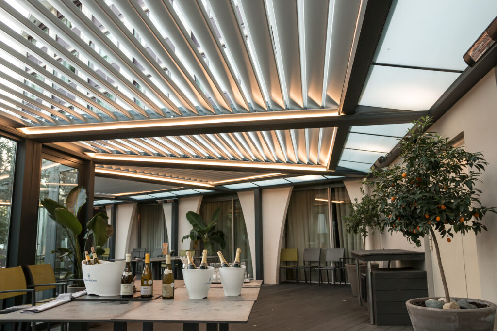 - Des stores, des parois vitrées ou des fermetures fixes ferment l’intégralité des côtés.